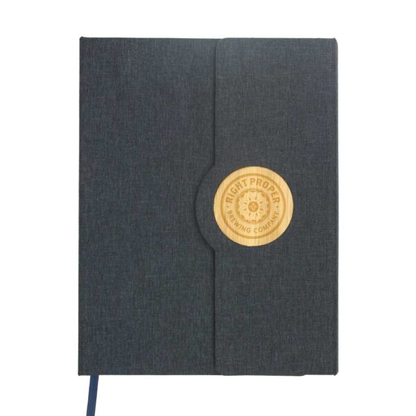 - A5 size RPET Fabric Hard Cover Notebook with Round Bamboo Trims and Magnetic closure