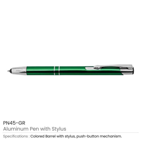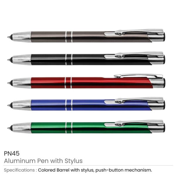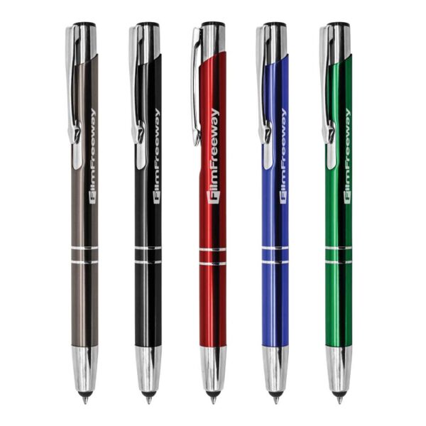 Introducing to you our aluminum pens with a stylus. It performs two different functions. It has been created with aluminum material. This multi-functional pen comprises a colorful metal barrel. This metal barrel comes in five different colors. The colors include black, green, silver, blue, and red. Apart from the barrel, it comprises a silver tip and clip. Thus, it’s a perfect branded pen for companies. The silver clip at the end of the pen works like a holder. Thus, you can attach the pen to your shirt or bag. This stylish metal pen also comprises a stylus so you can use it on your smartphones. It comes with a push-button mechanism. So, you can easily switch between the ball pen and stylus.