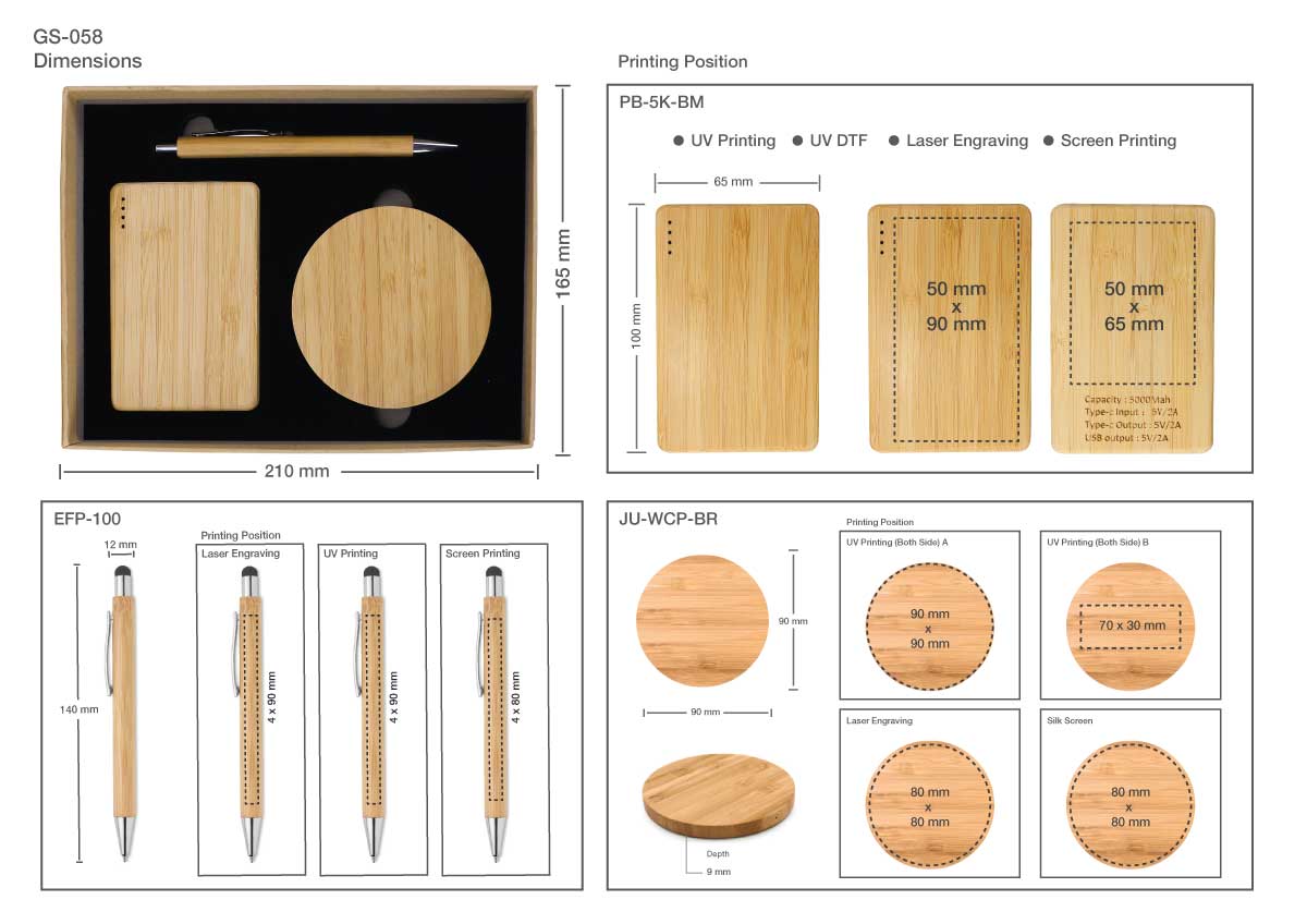 Product Combination: 1. JU-WCP-BR: Charging pad 2. PB-5K-BM:  Powerbank 5000mAh 3. EFP-100: Bamboo Pen 4. GB-R: Kraft Gift Box.