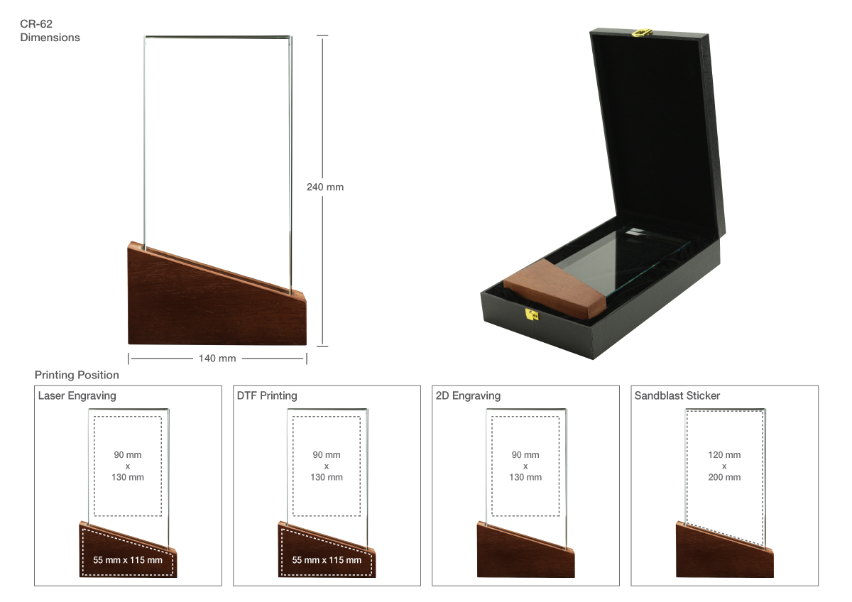 Rectangle Crystal Awards with a slanted design wood base in a Black Hard-board Box.
