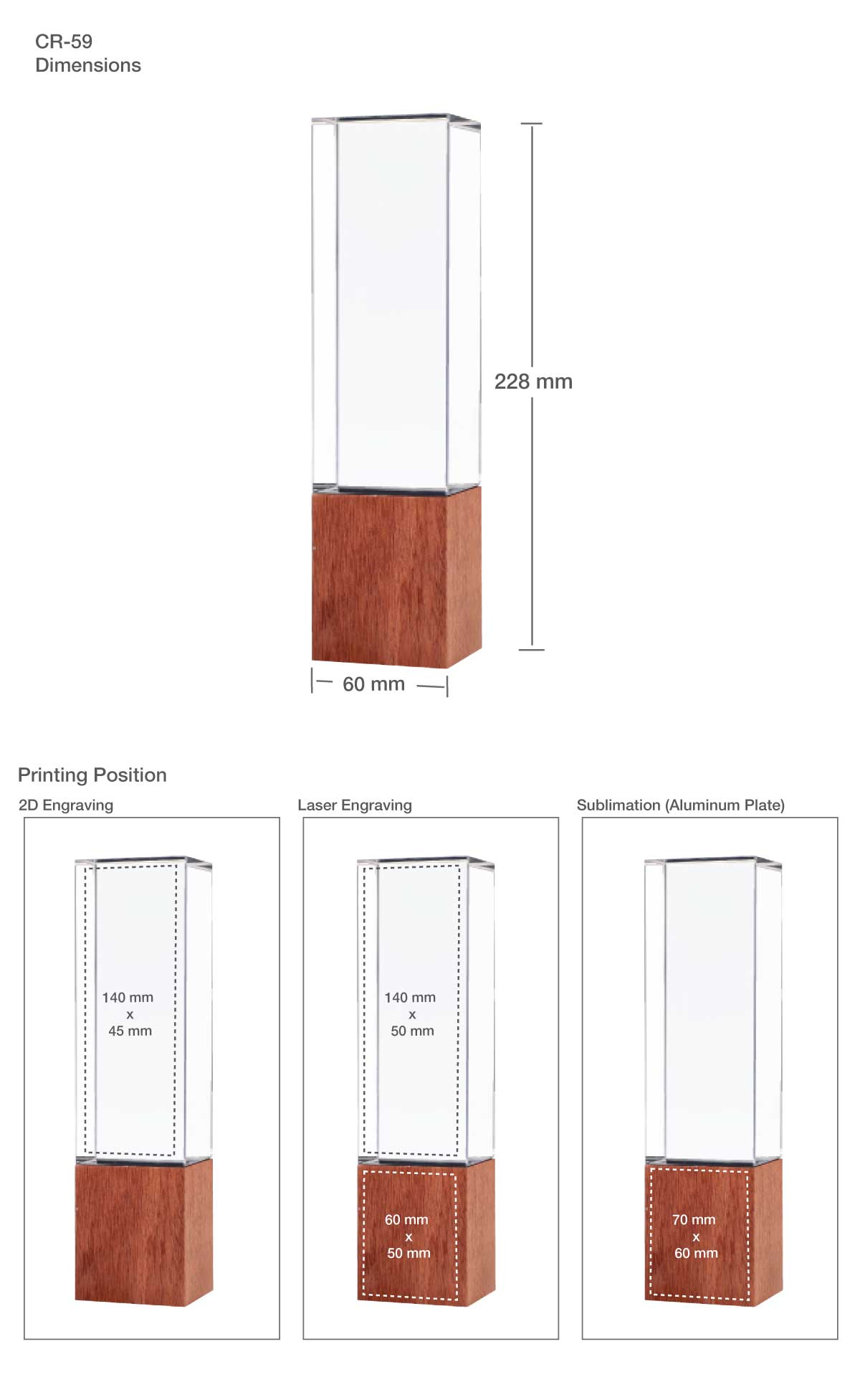 Cuboid-shaped crystal awards with wooden bases, and packed in a wooden presentation box.