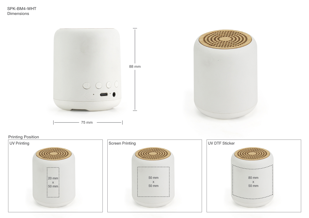 - Inside the box : (1) bamboo Speaker, (2) user manual (3) 30cm Type-C charging cable