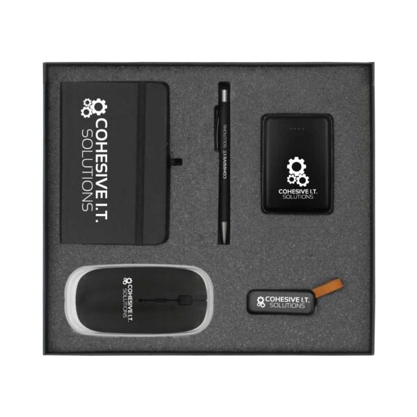 1. MB-06-BK: Black A6 size Notebook | 2. JU-WM-BK: Black Wireless Mouse | 3. JU-PB-5000-BK: 5000 mAh Powerbank | 4. PN42-BK: Rubberized Metal Pen with Stylus | 5. USB-20-BK: Black Slide Button USB Flash 8GB