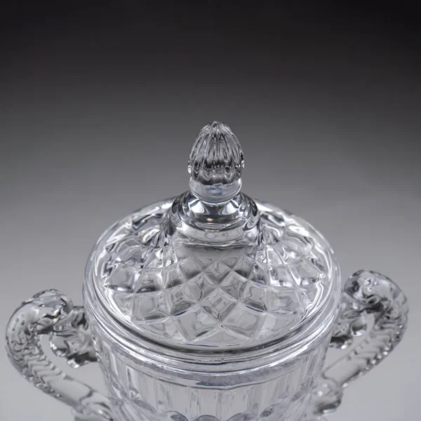 • Design: Large, clear cup with handles, mounted on a solid glass base
