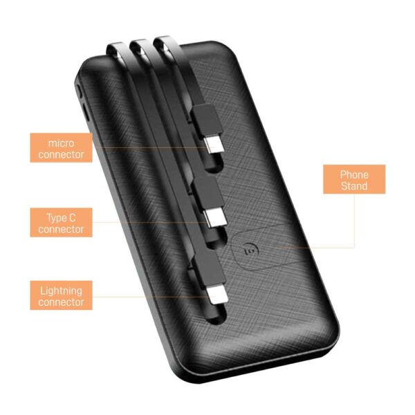 Powerbank with Inbuilt Cables, Texture design with built-in cables, and phone holder.