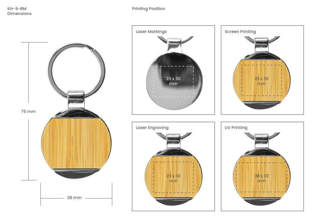 Round bamboo and metal keychains, metal in shiny nickel, front side with bamboo plate, with 32mm shiny nickel flat ring.