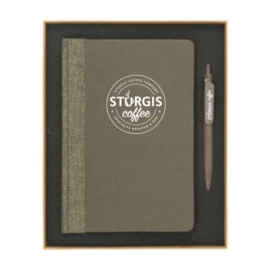 The rPET and Bamboo Notebook Gift Set is an elegant, eco-friendly stationery collection designed for modern professionals. Crafted with sustainable 300D rPET fabric and natural bamboo elements, it promotes environmental responsibility without compromising on style. The A5 notebook features 96 lined cream pages (70 gsm) with an elastic band closure, pen loop, and ribbon bookmark for added convenience. The set includes a matching bamboo pen with a black clip and smooth blue ink, completing the perfect executive combination. Presented in a premium black cardboard slide box, this gift set is ideal for corporate giveaways, conferences, or eco-conscious promotional campaigns.