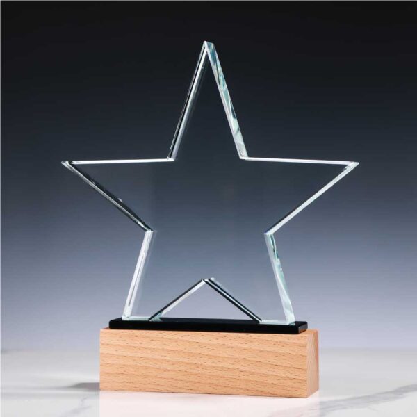 Star-shaped crystal awards with wood base and packed in a wooden presentation box.